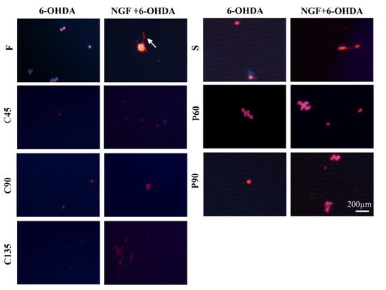 6-OHDA is a neurotoxin with a similar structure to dopamine which can selectively elicit cell death of dopaminergic neurons [33]. It is widely used in animal models of Parkinson’s disease. Figure 5 shows immunofluorescence images of β-tubulin III of PC12 cells treated with 6-OHDA (20 ng/mL) under different conditions. PC12 cells treated with 6-OHDA on different patterned surfaces exhibited substantial cellular apoptosis and almost no axonal differentiation. When the PC12 cells were pretreated with NGF for 5 days to obtain differentiated cells, and then 6-OHDA was added, the cells still exhibited a certain degree of apoptosis, but some axons could have remained. We also calculated the axon length as shown in Figure 6. The effect of 6-OHDA on cells was huge. The axons were hardly generated, and the generated axons also disappear as the cell dies. Among all groups, after being treated by NGF and 6-OHDA, the remaining axon length of the S group was the longest. This result may be helpful for us to construct a nerve injury model or a toxicological drug evaluation model.