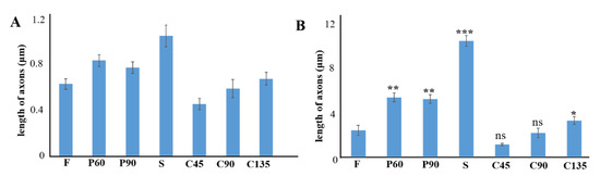 In addition, PC12 cell differentiation also showed a certain cell orientation and the ability to form neural networks. The axon extension on C45, C90, C135, and S structures tended to occur in the direction of the topography itself. Conversely, the neurite extension on P60 and P90 structures was relatively more random, although most of the axons turned and extended around a pillar. The immunofluorescence staining results of β-tubulin (Figure 3) and F-actin were similar. Among them, the cell axons of the S group showed the orientation of growing along the straight microstructure, while in the P60 and P90 group the cells were similar to the F group and could form the neural network. It might be because there was much space between the micropillars in the P60 and P90 groups the physical constraints have little effect on the direction of cell axon growth. This was also reflected in the similar axon length of P60 (68.3 ± 4.1 µm) and P90 (63.8 ± 3.6 µm) and suggested that the axon length was not affected by the angle between the micropillars.