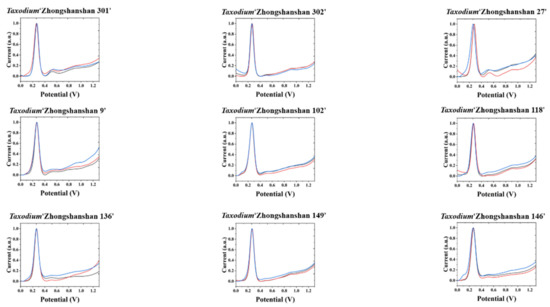 Electrochemical fingerprint of T. ascendens, T. distichum, T. mucronatum, T. ‘Zhongshanshan 405’, T. ‘Zhongshanshan 406’, T. ‘Zhongshanshan 407’, T. ‘Zhongshanshan 502’, T. ‘Zhongshanshan 503’, T. ‘Zhongshanshan 703’, T. ‘Zhongshanshan 111’, and T. ‘Zhongshanshan 125’ after water extraction and recorded under PBS condition.
