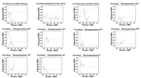 Scatter plots of T. ascendens, T. distichum, T. mucronatum, T. ‘Zhongshanshan 405’, T. ‘Zhongshanshan 406’, T. ‘Zhongshanshan 407’, T. ‘Zhongshanshan 502’, T. ‘Zhongshanshan 503’, T. ‘Zhongshanshan 703’, T. ‘Zhongshanshan 111’, and T. ‘Zhongshanshan 125’ combining the signals collected under ABS for the water extracts and under PBS for the ethanol extracts.