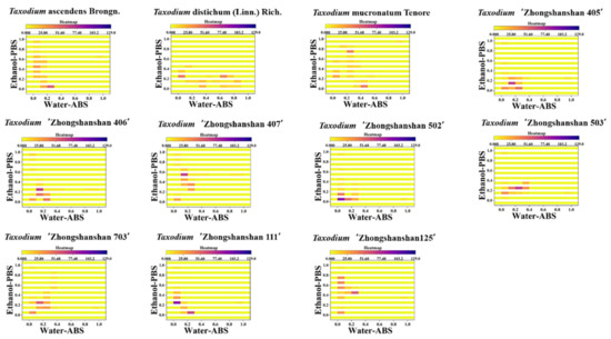 Two-dimensional density map of T. ascendens, T. distichum, T. mucronatum, T. ‘Zhongshanshan 405’, T. ‘Zhongshanshan 406’, T. ‘Zhongshanshan 407’, T. ‘Zhongshanshan 502’, T. ‘Zhongshanshan 503’, T. ‘Zhongshanshan 703’, T. ‘Zhongshanshan 111’, and T. ‘Zhongshanshan 125’ combining the signals collected under ABS for the water extracts and under PBS for the ethanol extracts.
