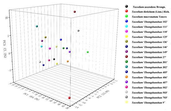 PCA analysis of T. ascendens, T. distichum, T. mucronatum, T. ‘Zhongshanshan 405’, T. ‘Zhongshanshan 406’, T. ‘Zhongshanshan 407’, T. ‘Zhongshanshan 502’, T. ‘Zhongshanshan 503’, T. ‘Zhongshanshan 703’, T. ‘Zhongshanshan 111’, T. ‘Zhongshanshan 125’, T. ‘Zhongshanshan 301’, T. ‘Zhongshanshan 302’, T. ‘Zhongshanshan 27’, T. ‘Zhongshanshan 9’, T. ‘Zhongshanshan 102’, T. ‘Zhongshanshan 118’, T. ‘Zhongshanshan 136’, T. ‘Zhongshanshan 125’, and T. ‘Zhongshanshan 146’.