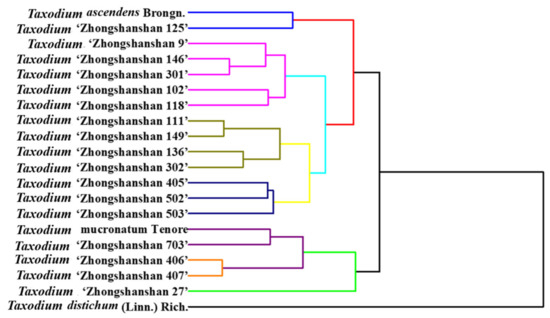 Dendrogram of T. ascendens, T. distichum, T. mucronatum, T. ‘Zhongshanshan 405’, T. ‘Zhongshanshan 406’, T. ‘Zhongshanshan 407’, T. ‘Zhongshanshan 502’, T. ‘Zhongshanshan 503’, T. ‘Zhongshanshan 703’, T. ‘Zhongshanshan 111’, T. ‘Zhongshanshan 125’, T. ‘Zhongshanshan 301’, T. ‘Zhongshanshan 302’, T. ‘Zhongshanshan 27’, T. ‘Zhongshanshan 9’, T. ‘Zhongshanshan 102’, T. ‘Zhongshanshan 118’, T. ‘Zhongshanshan 136’, T. ‘Zhongshanshan 125’, and T. ‘Zhongshanshan 146’ based on electrochemical fingerprints.