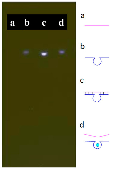 A substrate featuring an AP site was hybridized with the DNAzyme [28] to form a complex. The AP site was located at the fourth base from the 5′ end of the substrate; its complex could trap ATMND and quench its fluorescence. If the double-stranded form of the complex were to become denatured, i.e., after adding Cu2+, ATMND would be released, thereby re-emitting its fluorescence because the substrate itself could not trap ATMND in its single-stranded form. Verifying the behavior of the designed substrate and DNAzyme, Figure 1 presents the results of the gel electrophoresis of the complex in the absence and presence of Cu2+. Briefly, the substrate and DNAzyme were loaded into channels a and b, respectively. No significant band appeared in channel a due to the low fluorescent response of ssDNA towards SYBR Green I. Some intramolecular hybridization occurred within the DNAzyme sequence, as evidenced by a weak fluorescent band in channel b. After mixing both the substrate and the DNAzyme in channel c, a significant bright band appeared, signifying that the hybridization of the two substances had occurred. This complex was able to capture and quench the fluorophore ATMND before analysis. In channel d, the brightness of this band decreased after adding Cu2+, which triggered the cleavage of the substrate by the DNAzyme and denatured the double-stranded form of the complex. The dissociated DNAzyme and substrate lost their quenching property to ATMND. These findings indicate that the substrate and the DNAzyme functioned as expected in the absence and presence of Cu2+.