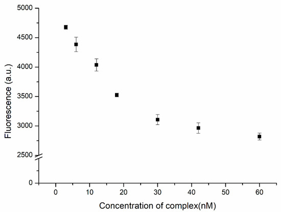 We used the complex formed from the substrate and the DNAzyme as the quencher of ATMND. In the presence of Cu2+ ions, ATMND was released as a result of the hydrolysis of this complex. In the absence of the quenching effect of the complex, the fluorescence of ATMND was restored. A better performance of this system could be achieved at a higher signal-to-noise (S/N) ratio. An excess of ATMND would result in not all of the fluorescence being quenched by the complex prior to detection, leading to strong background noise. In contrast, using an excess amount of the complex might lead to the proposed biosensor having blind areas, i.e., no response to the presence of the analyte, especially at low concentrations of the analyte. Therefore, the amount of complex required for the quenching of ATMND would need to be as high as possible to provide the lowest background noise, but an adequate response to the analyte would also be necessary. Figure 3 displays the fluorescence intensity of ATMND (at 30 nM) plotted with respect to the concentration of the complex. The fluorescence intensity decreased upon increasing the concentration of the complex from 3 to 30 nM and approached an asymptote thereafter, indicating that the complex had trapped most of the ATMND. The saturation ratio between ATMND and the complex was close to 1, consistent with the values given in previous reports [31,32]. As a result, a concentration of 30 nM for the complex was used as the optimized value for subsequent experiments.