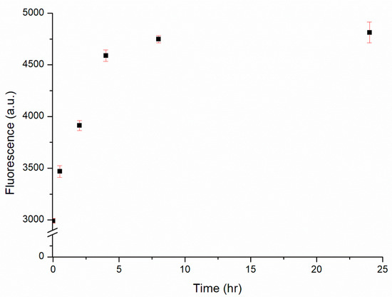 Fluorescence intensity of the DNAzyme complex (30 nM) in the presence of 1 μM Cu2+ over reaction times from 0.5 to 24 h.