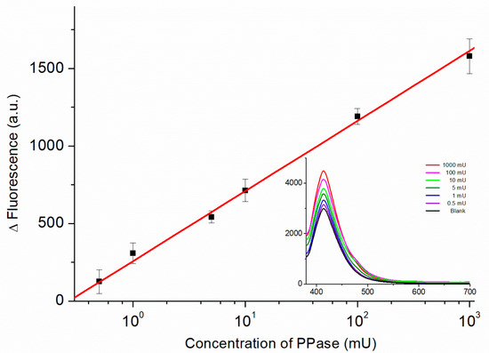Figure 6 displays the calibration curve obtained from the fluorescence spectra of the biosensor recorded in the presence of PPase at various concentrations. The relationship between the fluorescence intensity (ΔF = FPPase − FBlank) and the PPase activity (on a logarithmic scale) was linear from 0.5 to 1000 mU using the regression equation: