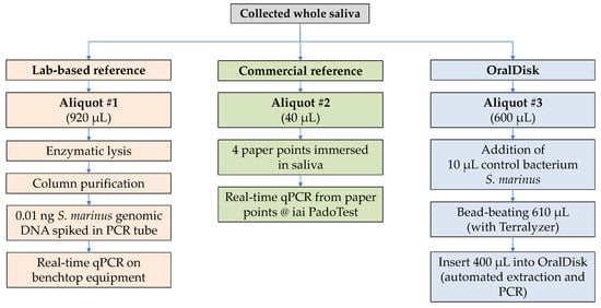 The iai PadoTest (Institut für Angewandte Immunologie IAI AG, Zuchwil, Switzerland) [] is a commercially available test that was used as a second reference to the OralDisk (Figure 1). It performs a multiplex real-time qPCR assay that estimates bacterial cell counts based on 16S rRNA []. The manufacturer’s collection protocol stipulates that paper points are inserted into dental pockets to collect gingival crevicular fluid (GCF). The paper points are stored in vials (one or more paper points per vial are possible, in single- or pool-mode of analysis). To make the results comparable with our saliva-based detection, the sample collection protocol was slightly modified: four paper points (Roeko Iso 55, Coltène, Altstätten, Switzerland) were immersed in 40 µL of thawed whole saliva in a tube. The tubes with the paper points were sent to iai PadoTest AG for analysis.