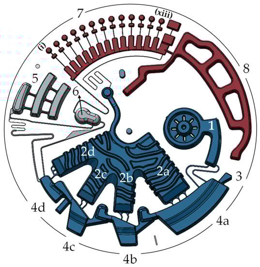 OralDisk design. Blue sector: magnetic bead-based extraction and purification of DNA. #1: sample inlet; #2: stickpacks for storage of buffers for: binding (2a), 1st washing (2b), 2nd washing (2c) and elution (2d); #3: pre-stored (air-dried) magnetic beads; #4: chambers for binding (4a), washing (4b, 4c) and elution of DNA from magnetic beads (4d). Grey sector: eluate transfer module, automating the inward pumping (#5) and eluate mixing with the lyopellet (#6). Red sector: amplification module, automating the preparation and execution of the real-time PCR in structure #7 in the reaction chambers labelled as (i)–(xiii). Structure #8 assists the liquid transfer from chamber #6 to the PCR structure #7.