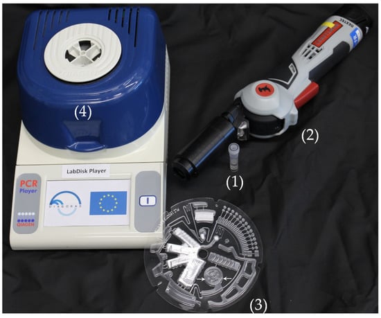 PCR thermocycling was performed in a customized LabDisk processing device functional model (QIAGEN Lake Constance, currently DIALUNOX GmbH, Lake Constance, Germany) (Figure 3) comprising: (i) a thermal module that enables global air heating for performing the necessary thermocycling protocols; (ii) a mechanical module for the precise positioning, acceleration and deceleration of the disks; (iii) an optical module for detection of the real-time fluorescence signal derived from the nucleic acid amplification product; and (iv) integrated magnets for bead transfer during the DNA extraction and purification. The raw data acquired with the LabDisk Player were analyzed using a RotorGene (QIAGEN, Hilden, Germany) software program to acquire Cq values.