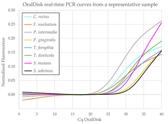 Quantitative shifts in the levels of multiple, rather than single, bacterial species may more accurately reflect dysbiotic changes in oral microbial ecology that are commensurate with the initiation or progression of oral disease []. Measurement of the species dynamics of oral polymicrobial populations is the key element that allows potential monitoring for the prevention, early diagnosis and post-treatment follow-up of oral diseases. Therefore, ten bacteria were included in the OralDisk panel: seven Gram-negative bacteria related to periodontitis (Aggregatibacter actinomycetemcomitans, Campylobacter rectus, Fusobacterium nucleatum, Prevotella intermedia, Porphyromonas gingivalis, Tannerella forsythia and Treponema denticola) and three Gram-positive bacteria associated with caries (oral associated Lactobacilli, Streptococcus mutans and Streptococcus sobrinus).
