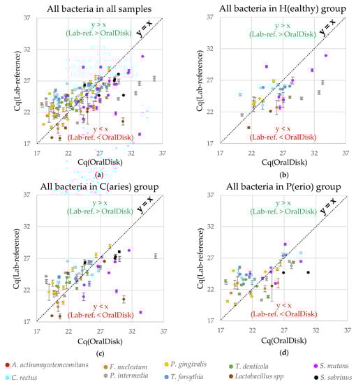 Scatter plots correlating the Cq values from the OralDisk and the lab-based reference for all bacteria: (a) in all three groups; (b) in the healthy group; (c) in the caries group; and (d) in the periodontitis group. Similar scatter plots for each individual bacterium are depicted in the Supplementary Figure S2.