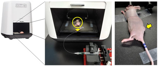 When the tumor size reached the designated grade, ICG (2.5 μg/g; Dongindang Pharmaceutical, Siheung-si, Korea) was injected into the respiratory anesthetized mouse intravenously using a catheter with a 29-gauge needle (Instech Laboratories, Plymouth Meeting, PA, USA). For intravenous catheterization, the needle was inserted into the tail vein of the mouse and fixed with tape. A syringe barrel without a needle (BD, Franklin Lakes, NJ, USA) containing ICG was attached to a syringe pump and connected with the catheter (Figure 1). The syringe pump (Braintree Scientific Inc., Braintree, MA, USA) was used to inject a certain amount of ICG at a constant rate (2.5 mL/min). At the same time as ICG was injected, the tumor was illuminated by 760 nm wavelength light. The fluorescence dyes with the same wavelength as ICG have a penetration depth of about 5 mm in the tissue [20], which is long enough for the subcutaneous tumor to come into focus at once. Time-sequence images of ICG fluorescence signals were acquired under the conditions of 3-fold magnification conditions (field-of-view of 5 cm × 5 cm), axial resolution of 27 μm, and longitudinal resolution of about 6.7 frames per second (150 ms intervals) for 75 sec under 100 ms exposure time using VISQUE® InVivo Smart-LF (Vieworks. Co, Ltd., Anyang-si, Korea), an optical in vivo imaging system for small animals with fluorescence and luminescence imaging capabilities. This device is equipped with an sCMOS camera with an 830 nm wavelength filter, providing an imaging speed of up to 37 frames per second with an exposure time of 25 ms to 15 min. The light source used was light emitting diode. Specifications for sCMOS camera, ‘VSP-4MU’ manufactured by Vieworks Co, Ltd., and VISQUE® InVivo Smart-LF equipment are detailed in Tables S2 and S3.