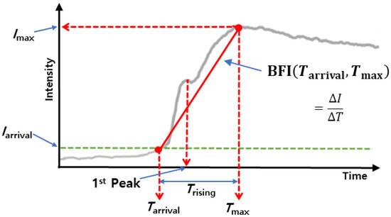 ICG dynamics with vascular parameters displayed. The red solid line indicates the slope of the peak time, BFI. Iarrival, the threshold value, is determined by one-tenth of Imax. The BFI was calculated by dividing the relative fluorescence intensity between Imax and Iarrival by Trising.