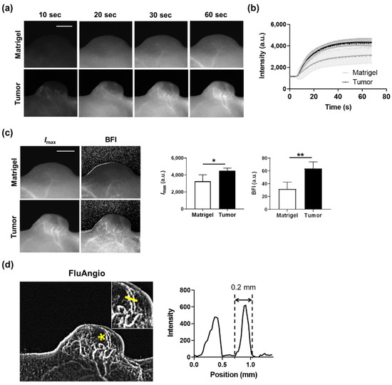 The following are available online www.mdpi.com/article/10.3390/bios11120471/s1: Figure S1: ROI drawn to include only the blood vessel area. Purple rectangles are enlarged on the right-hand side. Scale bar, 1 mm, Figure S2: ICG dynamics of a pixel on a tumor blood vessel when mouse movement due to breathing is reflected (left) and when artifacts are removed using Savitzky–Golay Filter (right), Figure S3: Preview (photograph), Imax, and FluAngio maps in an A431 tumor-bearing mouse. White arrows indicate the A431 tumor. Yellow and green arrowheads indicate blood vessels in the tumor periphery and within the tumor, respectively. Scale bar, 5 mm, Figure S4: Fluorescence images of A431 tumors for each grade determined based on the tumor size. The white arrow on Grade I indicates the location of the small palpable tumor. In Grades II, III, IV and V, black circles indicate blood vessels and white circles indicate outer areas. Tumor #3 is the one in Figure 4a. Scale bar, 5 mm, Figure S5: Changes in Imax and BFI when the entire tumor area is designated as an ROI by grade. Data are the mean ± SD for n = 8 mice per grade, Figure S6: Growth of A431 tumors in mice injected with IgG or mVEGFR1 Ab twice every three days. Data are the mean ± SD for n ≥ 7 mice per group. *, p < 0.05 determined via two-way ANOVA, Table S1: Comparison of VISQUE® InVivo Smart-LF equipment and other optical in vivo imaging systems for small animals with resolution, imaging depth and target, Table S2: Specifications for the sCMOS camera, VSP-4MU, Table S3: Specifications for the VISQUE® InVivo Smart-LF equipment. Video S1: Time-series acquisition of fluorescence images in tumor after intrave-nous injection of ICG.