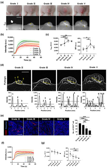 Immunostaining in tumor areas without prominent blood vessels showed that the number of CD31-positive vascular endothelial cells decreased as the tumor progressed (Figure 4e), consistent with the exacerbation of hypoxia during tumor progression [23]. Opposite changes in fluorescence intensity were seen in the localized area without prominent blood vessels depending on the grade (Figure 4b,f). Imax and the BFI also rapidly decreased as the grade increased (Figure 4g). This means that as the tumor grows, the thickness of blood vessels and blood flow in the main vessel area increase, whereas they decrease in the area with tiny vessels, which is non-detectable with the ICG technique.