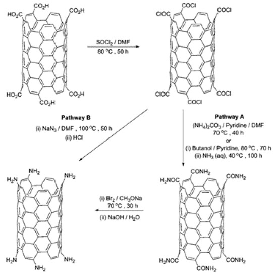 - Gromov, A.; Dittmer, S.; Svensson, J.; Nerushev, O.A.; Perez-Garcia, S.A.; Licea-Jimenez, L.; Rychwalski, R.; Campbell, E.E.B. Covalent amino-functionalisation of single-wall carbon nanotubes. J. Mater. Chem. 2005, 15, 3334–3339. [Google Scholar] [CrossRef]