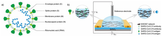 | SARS-CoV-2 nucleocapsid protein | Transistor | Antibody | 0.016 fg/mL | 0.016–16 pg/mL | [236] |
