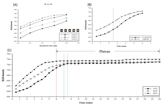 When AgNPs that participate in the color reaction react with the mercury standard, an optimal temperature and a time point exist for the detection, which need to be confirmed, especially when using RGB values as the basis for the detection results. In this experiment, three sets of environment temperatures for the machine, 37 °C, 40 °C, and 50 °C, were adopted to test the reactions between AgNPs and the mercury standard solution (2 ppb) with the changes in time and temperature. The changes in RGB values were measured, and the results obtained under different test environment temperatures were compared to determine the optimal temperature and time point for the detection.