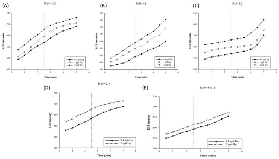 Metal nanoparticles have unique properties and applications in many fields, attributed to collective dipole oscillations called surface plasmon resonance (SPR) [46]. Therefore, the SPR phenomenon is very suitable for the colorimetric sensing of Hg2+ ions. The interaction between the nanoparticles and the analyte changes the intensity of the absorption band and/or the position in the visible spectrum, which can usually be observed with the naked eye [47]. The limitations of these systems are mainly related to poor selectivity, high detection limits of Hg2+, complex probe material synthesis, or complex analysis procedures. To discuss the optimal reaction volume ratio, the total volume of the AgNP reagent (R) and the mercury standard (S) dropped onto the test paper must be fixed. The experimental ratios were designed as 1:0.5, 1:1, and 1:2 (μL). The RGB values were detected using the reagent after reacting for 0.5–6 min at 50 °C, and the resolution gaps were compared.