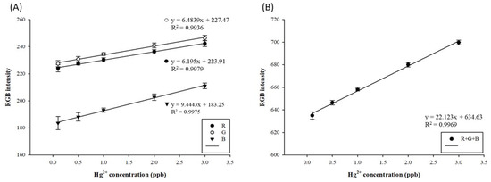 (A) RGB and (B) R+G+B standard straight curves of paper-based detection systems for mercury by using silver nanoparticles.