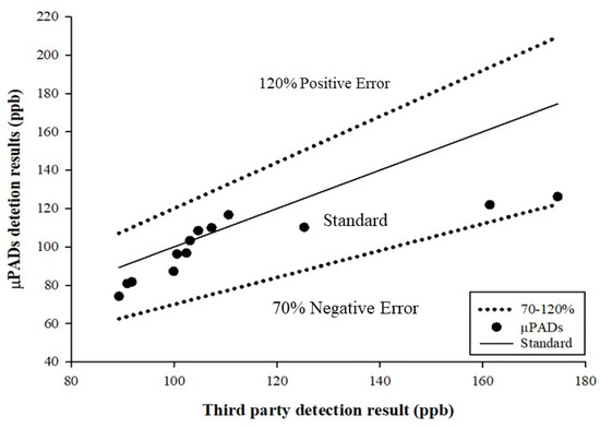 The recovery rate of the test sample was 70–120% in the concentration range of 0.01–0.1 ppm mercury, as developed in the calculation methodology presented by the Taiwan Food and Drug Administration (Validation Criteria of Food Chemical Inspection Methods) [43]. In this study, to test whether µPADs are suitable for determining food mercury content, commercially available salts (sample sources are provided in the Materials and Methods section) were dissolved in ddH2O, and the mercury standard was added to prepare 100 ppb salt water samples. The samples were tested using three methods (µPADs, UV–Vis, and CVAAS) and then sent to a third-party inspection unit for detection. The test results of the samples after the pre-treatment and dilution, obtained using the three methods and by the third party, are presented in Table 1. The third-party inspection result was adopted as the reference to compare the detection results. Although the µPAD data of S1006 (87.22 ppb) are different from the test data obtained by the third-party certification (174.6), we do not rule out the possibility of sampling errors. Since the detection results of µPADs (87.22 ppb), UV–Vis (90.9 ppb), and CVAAS (110.2 ppb) were relatively similar, we retained the data and used them as a follow-up evaluation for the methodological aspects in the analysis of the difference between µPADs and the third-party certification. On the other hand, the W1000 data part was used to dissolve commercially available salts and ddH2O equipped with mercury standard products. Therefore, in µPADs, UV–Vis, and CVAAS, and then after the third-party inspection, it was shown that it cannot be detected (not detectable, ND). As illustrated in Figure 5, the detection results obtained using µPADs are all within the range of the detection recovery rate of 70–120%, which is in line with the criteria presented in the methodology. Taiwan’s national announcement limits the detection of mercury and methylmercury in different foods; for example, the mercury limit for packaged water and edible ice is 1 ppb, while the limit for salt is 100 ppb. Therefore, this research aimed to develop an appropriate detection module for the application of mercury contamination detection in food.