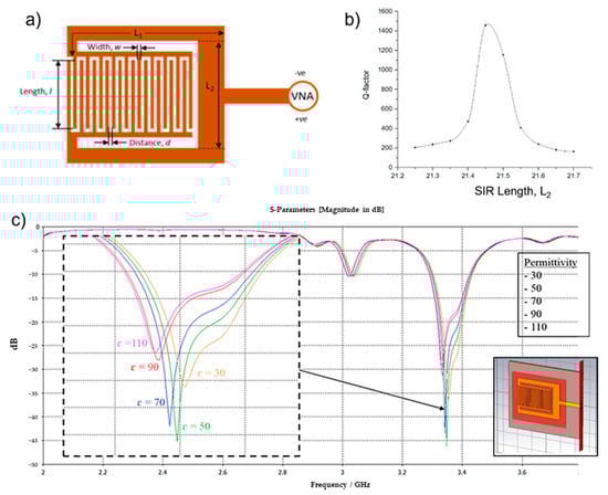 To optimize the Q factor, simulations were done using CST Microwave Studio in which the SIR length was varied, and the sensor’s frequency response was obtained. The design dimension unit was set in millimeters (mm). The simulations were performed in a frequency range of 1 GHz to 5 GHz. Based on the above equation, L1 has no significant effect on the performance of SIR and was kept constant for the simulations, while L2 varied between 21.2 and 21.7 with a step of 0.1. The Q factor of each L2 value was calculated based on the RF sensor’s simulated frequency response, and the plot of Q versus L2 is shown in Figure 1b. The highest value of Q factor obtained was 1455 when L2 = 21.45 mm. Q factor values of near or over 1000 at frequencies between 100 MHz and 1 GHz are suitable for sensing applications and can adequately reduce high-frequency losses [23].