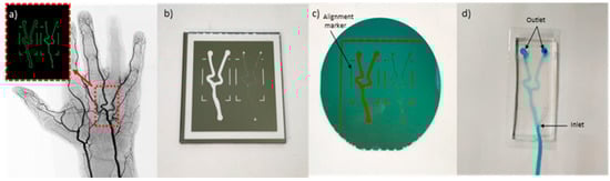 Dimensions of the ulnar artery were obtained from Fazan et al. [24], who studied 46 male, embalmed human cadavers. In this study, the mean diameter of the ulnar artery on the right hand was found to be approximately 2.5 ± 0.2 mm. The design of the channels was drawn in Adobe Illustrator, as shown in Figure 2a, to closely mimic the angiogram images of the hand artery obtained from [25]. Angiography typically involves injection of a radio-opaque contrast agent into the blood vessels and, using the X-ray imaging, the blood vessel shapes can be captured. The design was then fabricated into a chromium on glass mask, as shown in Figure 2b. Soft lithography methods were used to produce the design mold, as shown in Figure 2c. Fabrication steps are detailed in Section 2.3. The fabricated microfluidic device in PDMS is shown in Figure 2d. The size of the microfluidic device corresponds to the size of the RF sensor, which is 40 × 50 mm, and alignment markers were included in the mask design to provide constant placement of the channel on the sensor when taking the experimental measurements.
