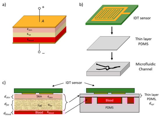 When the sensor is placed on a human hand, the capacitive model of the layers can be represented as a 3-layer stack of skin, fat and blood, as shown in Figure 3a. The interdigital sensor is represented as capacitive parallel plates. To accurately model the dielectrics that are present in the hand, a thin layer of PDMS is placed in between the sensor and the microfluidic channel, as shown in Figure 3b. The dielectric value of this thin PDMS layer should match the dielectric values of skin and fat, while the dielectric value of blood is the unknown. The total capacitance of skin and fat can be expressed as follows: