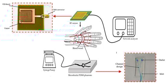 Figure 5 shows the fabricated sensor (a), the testing scheme using the microfluidic vascular phantom in lieu of a human hand (b). The microfluidic device was connected to a syringe pump. Measurements of glucose levels using the RF sensor is done without direct contact with blood, allowing the sensor to be reusable as there is no contamination. The fabricated sensor is connected to a network analyzer and the frequency response at each concentration can be obtained. The usage of a microfluidic vascular phantom eases the testing methods and reduces the need of using human subjects at the prototype level.