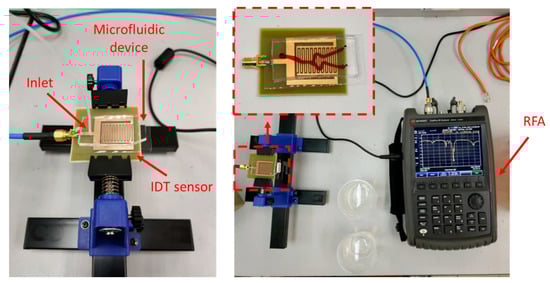 Experimental setup used for RF sensor measurements. Left: The microfluidic device is placed on top of the RF sensor. The inlet of the microfluidic channel is connected to a syringe pump. Right: The RF sensor is connected to a Keysight Fieldfox RF Analyzer.
