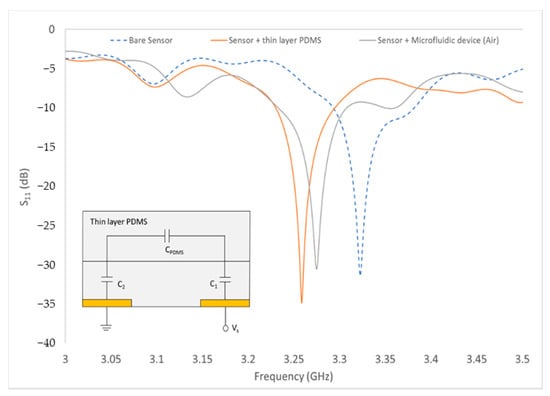 Measurement of the bare sensor, sensor with thin-layer PDMS and sensor with microfluidic device. (Inset: Equivalent circuit of RF sensor with thin-layer PDMS).