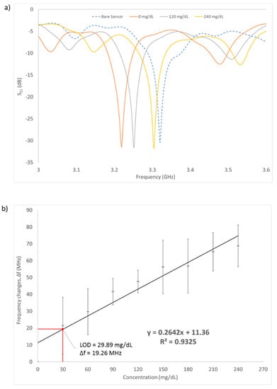 (a) S11 measurement results of the sensor with varying glucose concentration (0, 120, 240 mg/dL). (b) Frequency changes with increasing value of glucose concentration. Limit of detection was found to be 29.89 mg/dL. Measurements were made in triplicates. Error bars are also shown in the graph.