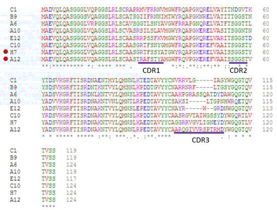 The most promising clones were analyzed with the Paratome online tool [27] that should identify the residues (Antigen Binding Regions—ABRs) putatively involved in the antigen recognition more accurately than conventional methods for CDR sequence determination (Supplementary Materials Figure S2). For all the clones, the calculated ABR1 included more residues than usually attributed to standard CDR1. In the absence of structural information, it is impossible to evaluate how precise the prediction can be, but the ABR1 sequences, indeed, comprise the actual length of the variable region centered on nanobody CDR1, as evidenced by the multiple alignment analysis (Figure 1).