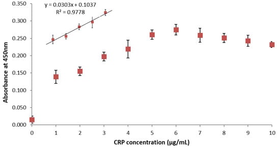 The dose-dependent detection of the antigen was evaluated using the short ELISA protocol described above by using variable concentrations of CRP (1 to 10 µg/mL) and 25 µg/mL of E12 fused to mouse Fc (E12-mFc) in combination with anti-mouse secondary antibodies fused to HRP. The experiment was performed in triplicate.