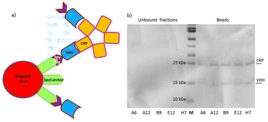 Nanobody-dependent CRP Immunoprecipitation. (a) Schematic representation of the procedure: nanobodies (VHHs) interact with CRP in solution and then are covalently bound to SpyCatcher-functionalized magnetic beads by means of their SpyTag. Beads are recovered with a magnet, boiled and the resulting samples separated on an SDS-PAGE (b). Nanobodies covalently bound to the beads do not enter the gel, but nanobodies bound only to CRP subunits are released under denaturation conditions and migrate to the expected place.
