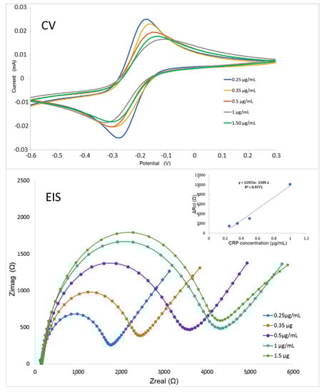 An impedance-based electric circuit was functionalized with the anti-CRP nanobody E12 and tested at different antigen concentrations. The spectra of both Cyclic Voltammetry (CV) and Electrical Impedance Spectroscopy (EIS) of a typical experiment are reported. Three repeats were performed for each antigen concentration.