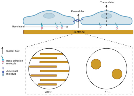 Electric cell-substrate impedance sensing (ECIS) schematic of current flow. Resistance measurements acquired by ECIS are a consequence of current flow through multiple pathways. Current flows through the basolateral, paracellular, and transcellular compartments. The cellular biology dictates the pathway that provides the most resistance to current flow. Current flow is impeded by the presence of strong basal adhesion proteins, paracellular junctional proteins and the cell body atop the electrode. ECIS electrode configurations include, but are not limited to, an interdigitated orientation of electrodes that measure a large surface area of a well, or two small circular electrodes that measure a comparatively smaller surface area of a well. Consult the Applied Biophysics website (https://www.biophysics.com/; accessed on 19 October 2021) for the most up-to-date array types and configurations.