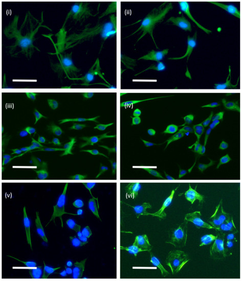 Morphology of adherent glioblastoma stem-like cells. The cells were stained for various cytoskeletal intermediate filaments to optimally reveal the cellular morphology and adherent shape of the cells. Cells were seeded at low density (5000 cells per well) and grown on laminin for 2–3 days. All images are from stem cell cultures of (i) and (ii) NZB11 stained for nestin, (iii) and (iv) NZB19 stained for nestin, (v) NZB12 stained for nestin, and (vi) NZB12 stained for actin. Scale bar is 50 µm.