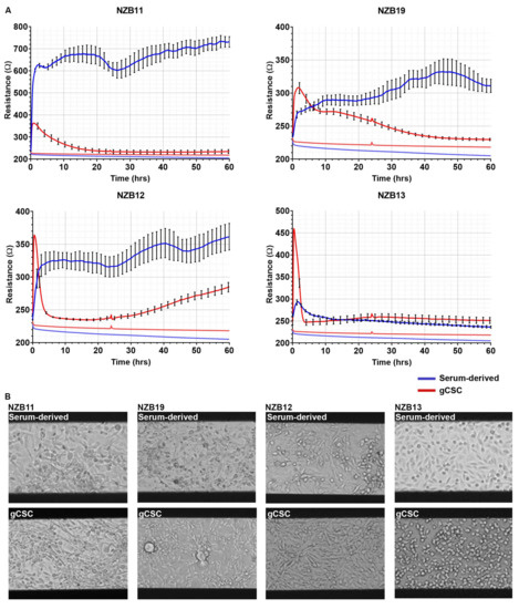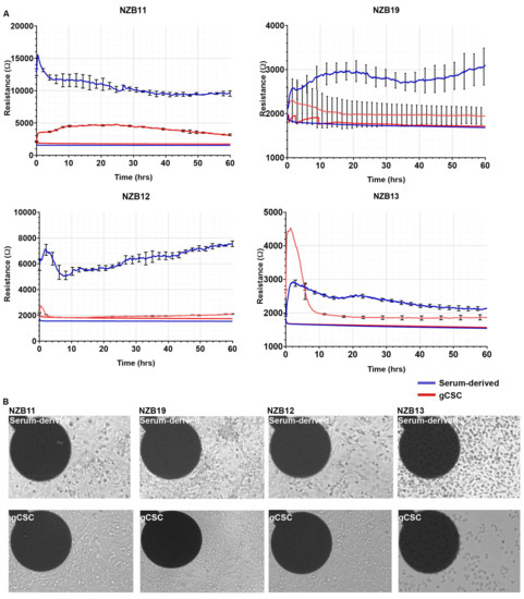 The following are available online at https://www.mdpi.com/article/10.3390/bios11120498/s1, Figure S1 Serum-derived and gCSC cell resistance on 96W1E+ ECIS arrays. Phase contrast images of NZB11, NZB12, NZB19, and NZB13 serum-derived and gCSC cells after 60 h of growth on 96W1E+ ECIS arrays. Images acquired at 20× magnification. Data are representative of three independent replicates.