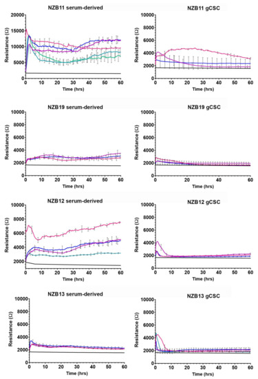 Representation of inter-experimental variability of serum-derived and gCSC cells grown on 96W1E+ ECIS arrays. Resistance measurements at 4000 Hz over 60 h of growth. Comparison of adhesion of NZB11, NZB12, NZB19, and NZB13 serum-derived and gCSC cells seeded at 80,000 cells. Growth profiles, referenced against a cell-free control well (black line), are shown. Each coloured adhesion profile represents an independent replicate.