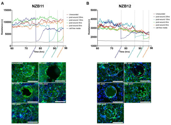 Wound healing profiles of serum-derived GBM cells. (A) NZB11 and NZB12 serum-derived cells grown on 8W1E ECIS arrays for 76 h (time point at which stable resistance measurements are acquired). Cells were seeded at 80,000 cells per 0.33 cm2. Wounding was induced at 76, 86, 92, and 96 h post-seeding. Wound healing measurements were carried out for 20, 10, 4, and 0 h, corresponding to each wounding time point. Data shows resistance measurements acquired between 60–98 h. Data are representative of three independent replicates. (B) Representative fluorescent images show electrode regions 0, 4, 10, and 20 h post-wounding. Unwounded control shown for reference. Cells were stained with Actin Green™ 488 (green) and Hoechst 33342 (blue). Phase electrode ring shows the periphery of each electrode. Images acquired at 20× magnification. Scale bar = 200 µm. Data is representative of three independent replicates.