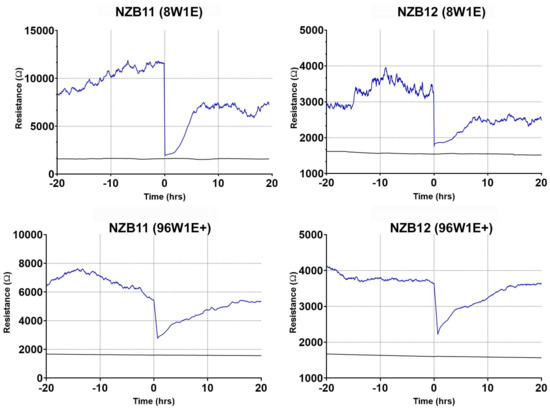 Comparative wound healing profiles of serum-derived GBM cells on 96W1E+ and 8W1E ECIS arrays. NZB11 and NZB12 serum-derived cells grown on 8W1E ECIS arrays for 76 h (time point at which stable resistance measurements are acquired). NZB11 and NZB12 serum-derived cells grown on 96W1E+ ECIS arrays for 95 h (time point at which stable resistance measurements are acquired). Cells were seeded at 80,000 cells per 0.33 cm2. Time 0 represent the point that the wounding current was applied. Resistance measurements were acquired at 4000 Hz. Data are representative of three independent replicates.