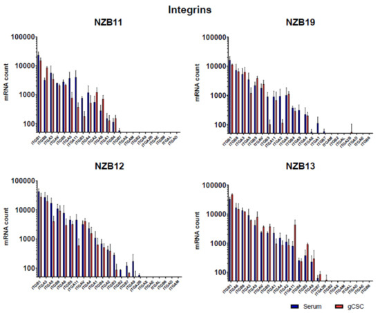 Integrin gene expression by glioblastoma serum-derived and gCSC cells. NanoStringTM analysis of absolute mRNA count in NZB11, NZB19, NZB12, and NZB13 serum-derived and gCSC GBM lines. The results of two independent experiments are shown. Unpaired students t-test analysis was carried out as a comparison of the serum vs gCSC mRNA count where p-value ≤ 0.05. None of the comparisons for any of the genes were significant.