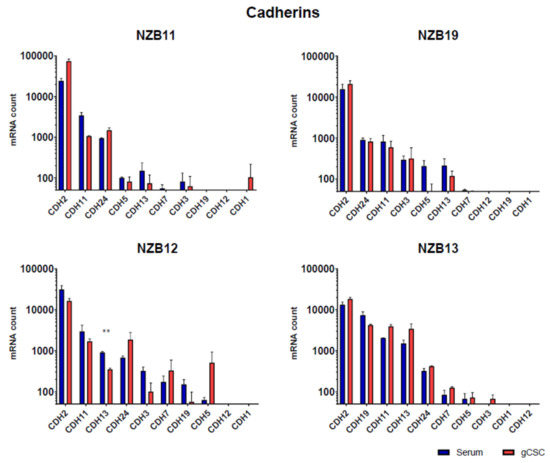 Cadherin gene expression by glioblastoma cells. NanoStringTM analysis of absolute mRNA counts in NZB11, NZB19, NZB12, and NZB13 serum-derived and gCSC GBM lines. The results of two independent experiments are shown. Unpaired students t-test analysis was carried out comparing the serum vs gCSC mRNA count for each gene where p-value ≤ 0.05 (*) and 0.01 (**).