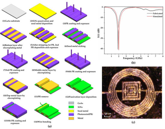 Figure 2a depicts the fabrication process for the device, which was divided into three metal layers based on bottom-up IPD fabrication. We selected GaAs substrate as a semi-insulating material to reduce the parasitic effect significantly and increase the resonant frequency and quality of high frequency [27].