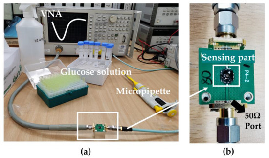 Experimental setup for the tests. (a) The experimental setup and preparation for the meas-urement of glucose level. (b) The tested device connected to a vector network analyzer (VNA) through a 50 Ω port.