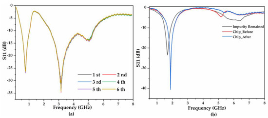 Pre-reliability and reusability investigation. (a) Six experiments for testing the 150 mg/dL glucose solution. (b) Unloaded chip resonance performance before and after the experiment.
