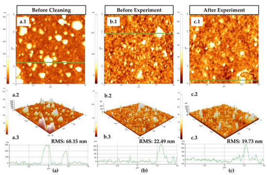 Figure 5(a.1,a.2,a.3) illustrate the unloaded unpackaged biosensor before cleaning, wherein the RMS value of 68.15 nm is presented in two-dimensional (2-D) and three-dimensional (3-D) representations. Following washing, we observed that the RMS value decreased to 22.49 nm before the experiment, as depicted in Figure 5(b.2). The apparent change implies that the invisible impurities that existed during storage were removed, verifying that cleaning before the test was necessary. As the chip with the droplet could not be tested by the AFM equipment because of its probe distance limitation, we considered the same unloaded biosensor after the experimental process with an RMS value of 19.73 nm (Figure 5(c.3)). The RMS values of the chip before and after the experiment exhibited only a minor deviation. Moreover, the surface profile results indicated high consistency between the groups before and after the experiment, as depicted in Figure 5(c.1,c.2,c.3). The obtained results verified that no chemical immobilization or deterioration on the surface occurred and no frequency shift was generated during the experiment. Thus, the high reusability and reliability of the sensor at both microcosmic and macrocosmic levels could be validated.