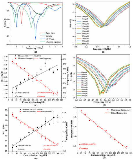We selected S11 as the reference signal owing to its high resistance to environmental interference in multiple electromagnetic transmission parameters. To evaluate the S11 response of the biosensor to the introduced liquid, DI water was used as a reference and compared with the unloaded condition depicted in Figure 6a. Additionally, serum and 100 mg/dL glucose aqueous solution were added and compared, inducing various responses from the sensor. The bare biosensor resonant frequency at 1.80 GHz shifted to two peaks of 1.054 GHz/−29.354 dB and 3.958 GHz/−44.089 dB for DI water. Herein, the former was considered the decrease from the original frequency of 1.80 GHz because of the air-bridge capacitive effect of the sample; the latter was evaluated as the introduced sample capacitance-like effect (Figure S2). Moreover, no overlap occurred between the responses to different concentrations at the resonant frequency in Figure 6b,d, validating its high sensitivity to support subsequent analysis.